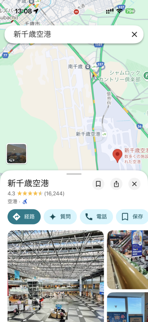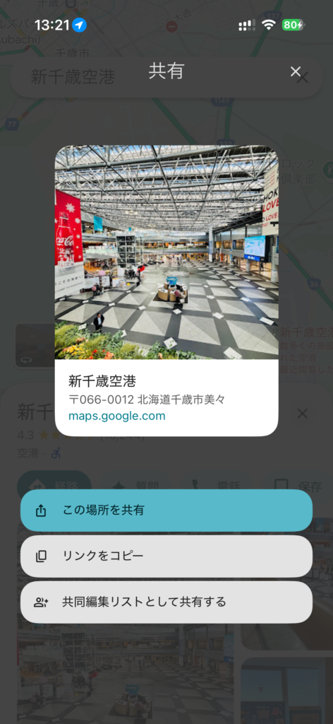スマホでこのように好きな目的地を選び、上の写真のピンの下にある四角に上矢印のボタンをタップします。