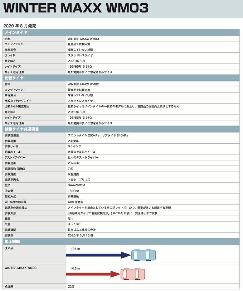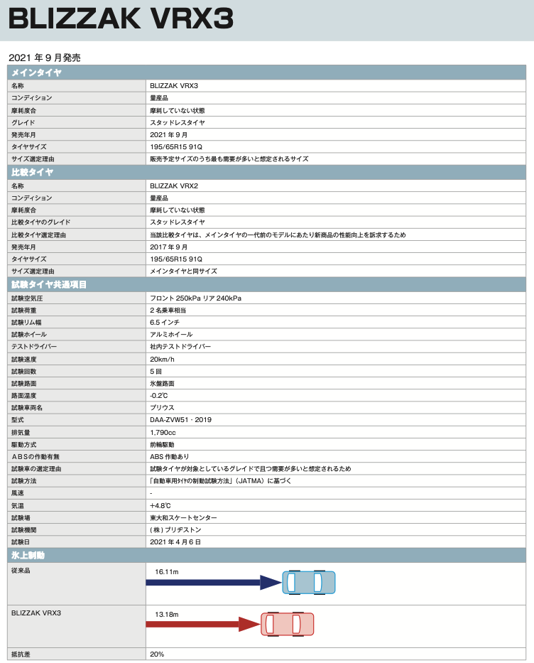 タイヤメーカーは従来モデル比でどの程度の氷上制動距離が改善したかというデータをタイヤ公正取引協議会に提出しています。