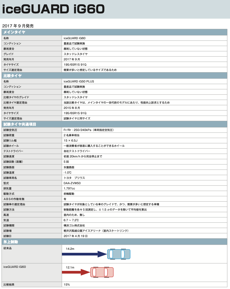 ヨコハマは2017年が路面温度-1度、2021年は-2.7度での試験ですが、iG60の制動距離はそれぞれ12.1m、12.5mと差が僅かであるという点も信頼がおけるデータだと思います。